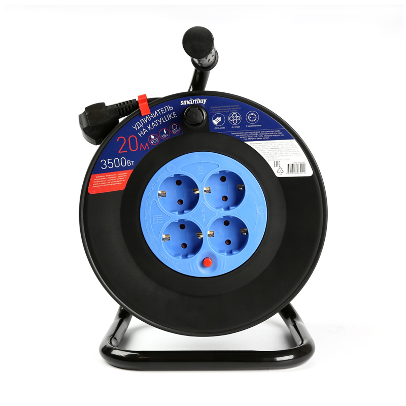 Удлинитель на катушке силовой Smart Buy, 20 метров, с заземлением, предохранитель, 4 гнезда, ПВС 3*1,5, 16А/3,5кВт