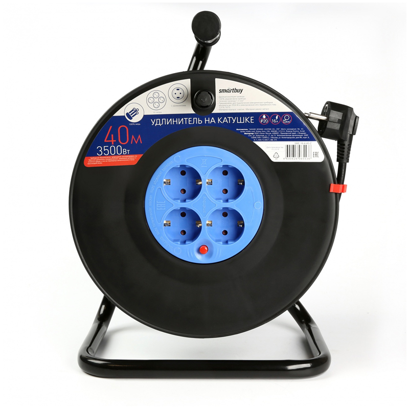 Удлинитель на катушке силовой Smart Buy, 40 метров, с заземлением, предохранитель, 4 гнезда, ПВС 3*1,5, 16А/3,5кВт