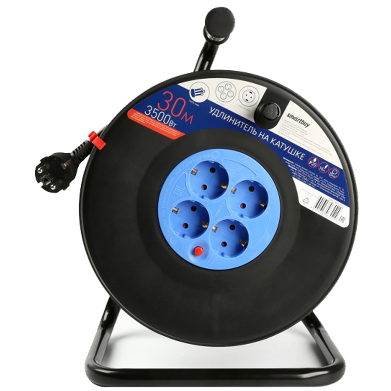 Удлинитель на катушке силовой Smart Buy, 30 метров, с заземлением, предохранитель, 4 гнезда, ПВС 3*1,5, 16А/3,5кВт
