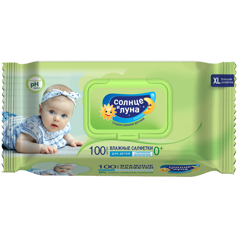 Салфетки влажные Солнце и луна, 100шт., детские, очищающие, экстракт липы,крышка клапан