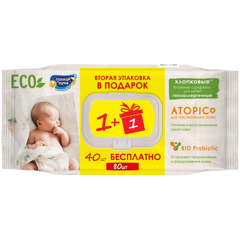 Салфетки влажные Солнце и луна "Eco. Atopic", детские, 40шт+ПРОМО