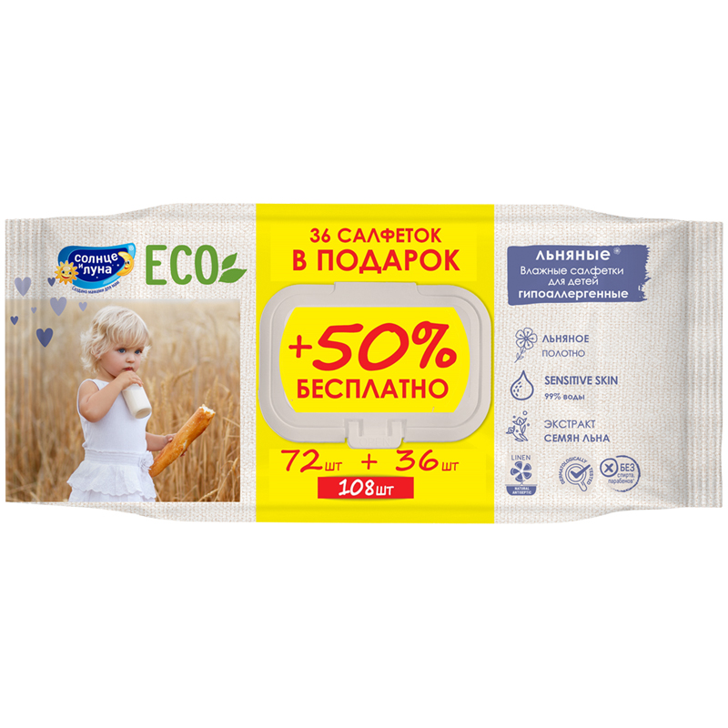 Салфетки влажные Солнце и луна "EСО", детские 0+, льняные, 72 шт+50% в подарок