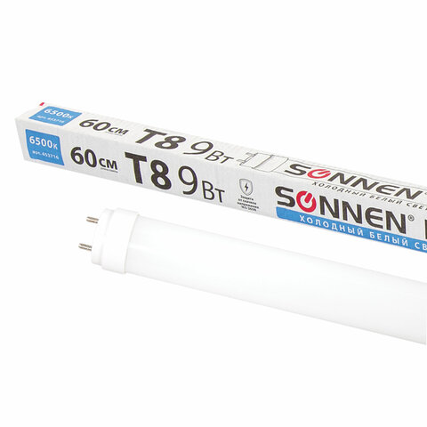 Лампа-трубка светодиодная SONNEN, 9 Вт, 30000 ч, 60 см, холодный белый (аналог 18 Вт люминесцентной лампы), LED T8-9W-6500-G13, 453716