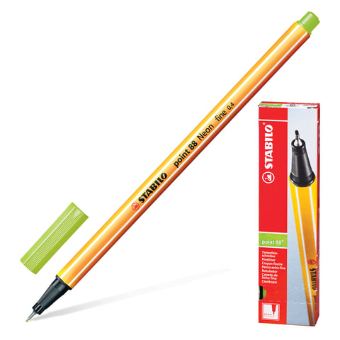 Ручка капиллярная (линер) STABILO "Point 88", НЕОНОВАЯ ЗЕЛЕНАЯ, корпус оранжевый, линия письма 0,4 мм, 88/033