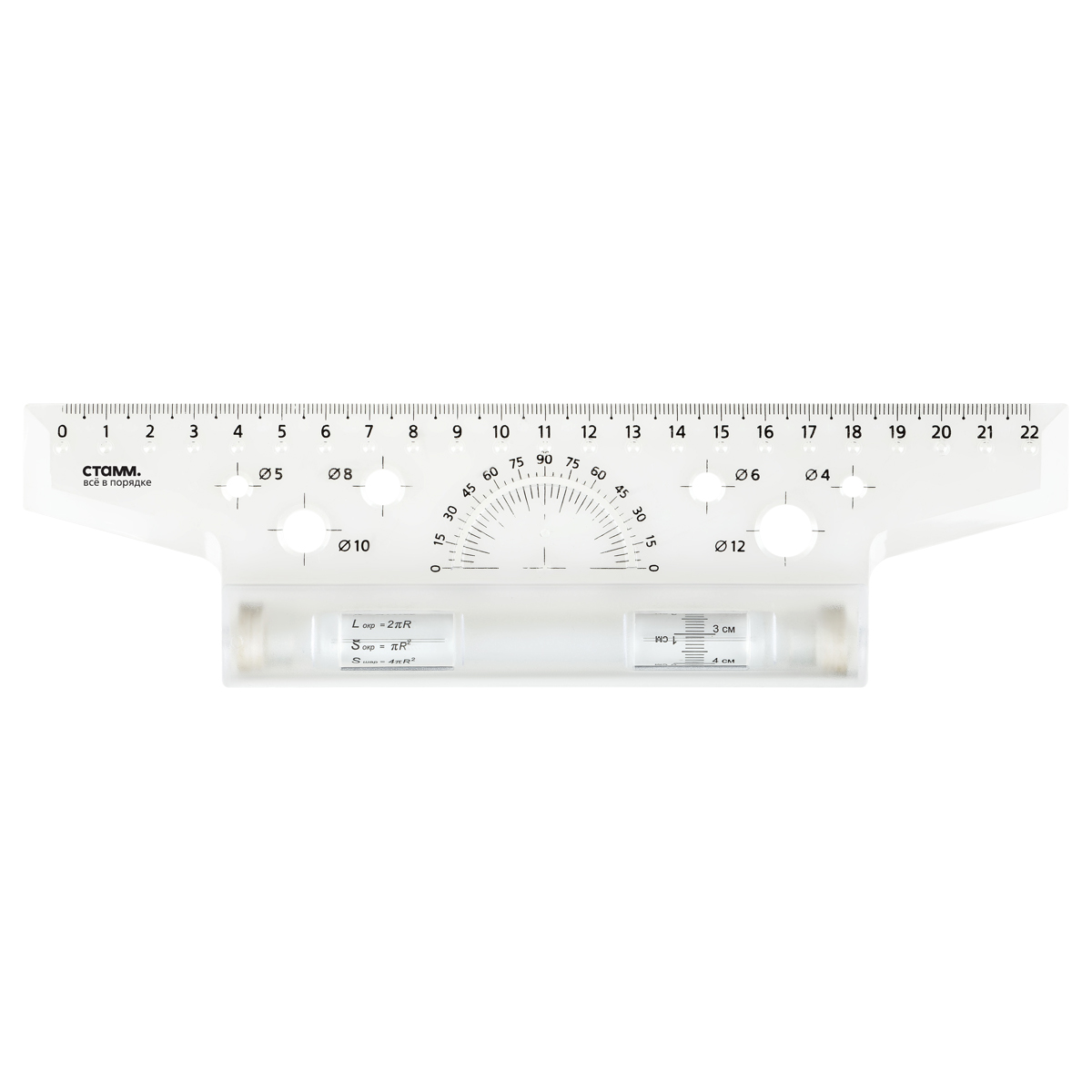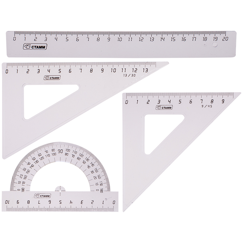 Набор чертежный средний СТАММ, (треуг. 2шт., линейка 20см, транспортир), прозрачный бесцветный