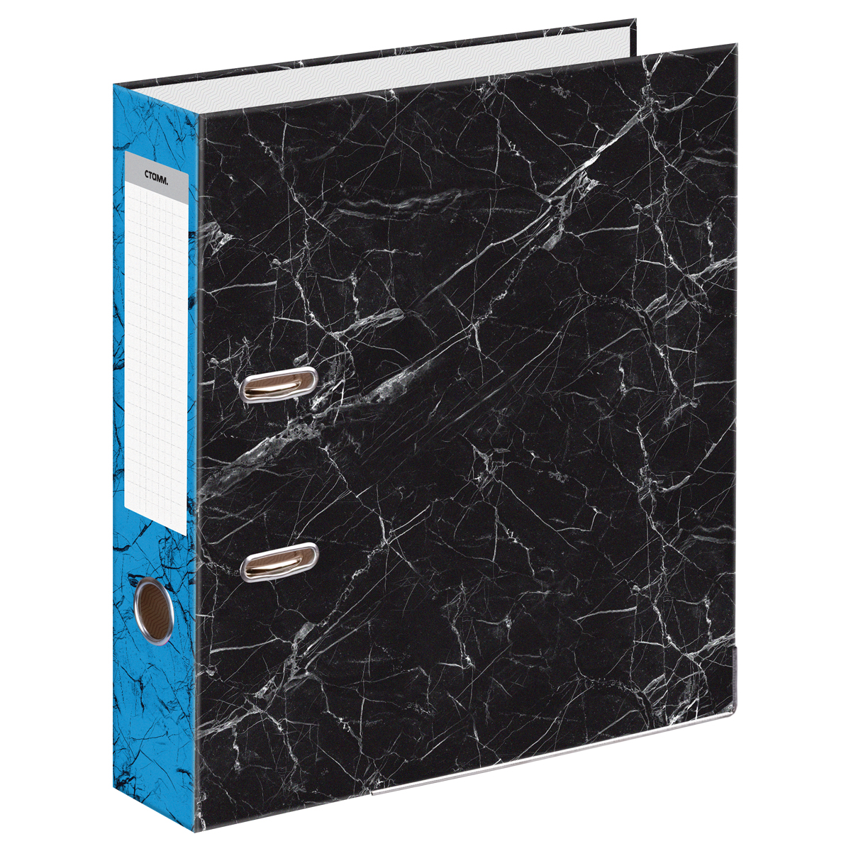 Папка-регистратор СТАММ, 70мм, мрамор, черная, синий корешок, нижний метал. кант