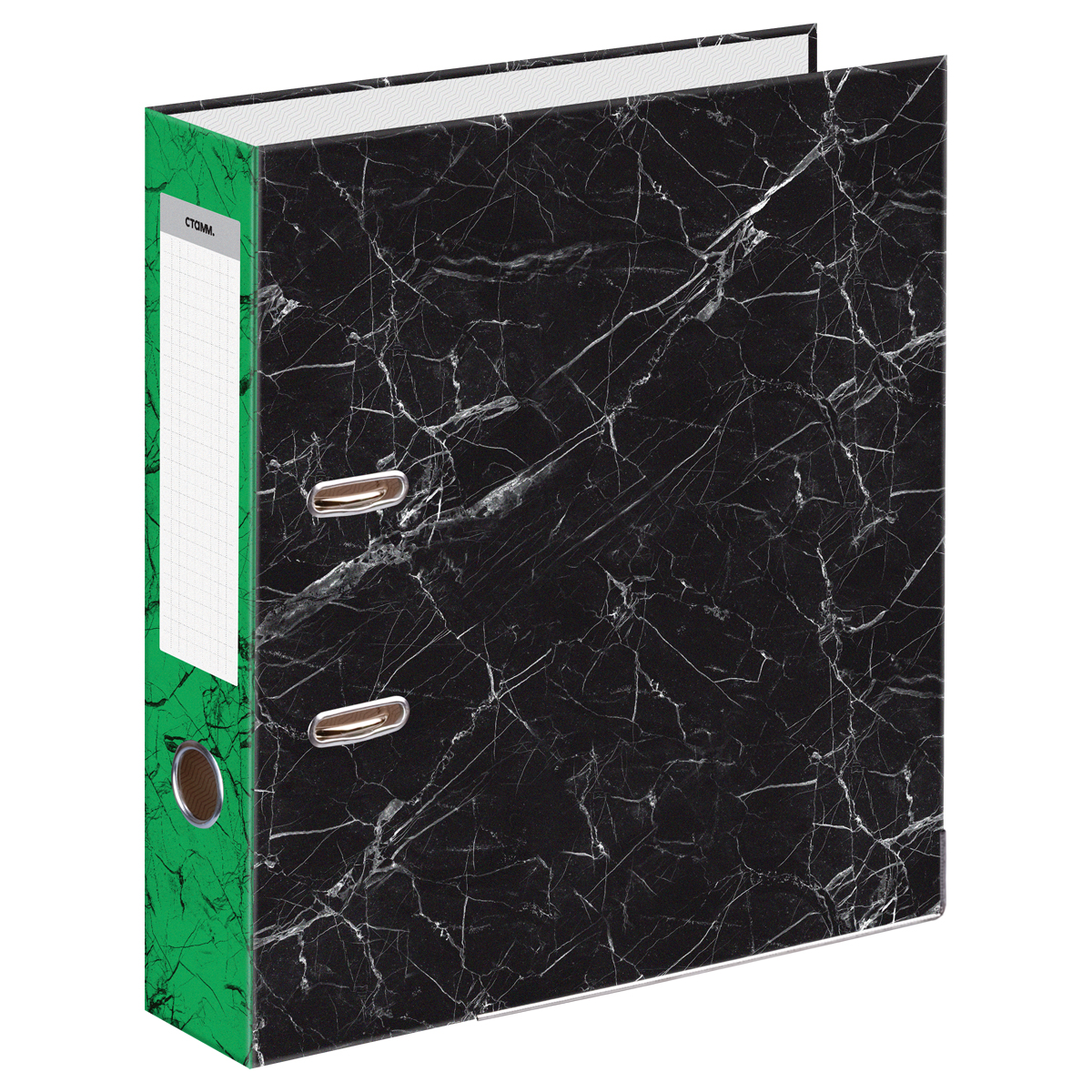 Папка-регистратор СТАММ, 70мм, мрамор, черная, зеленый корешок, нижний метал. кант