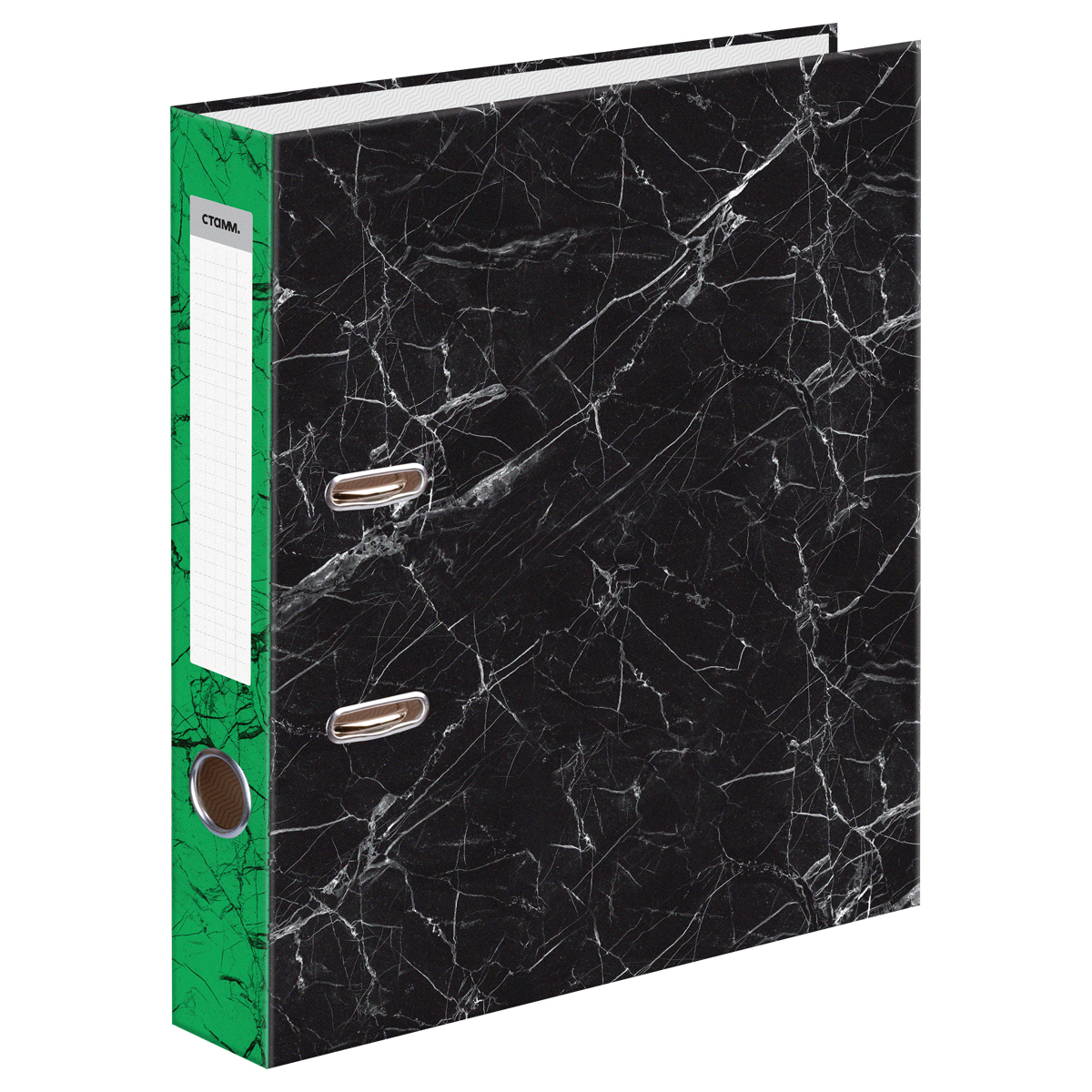 Папка-регистратор СТАММ, 50мм, мрамор, черная, зеленый корешок, нижний метал. кант