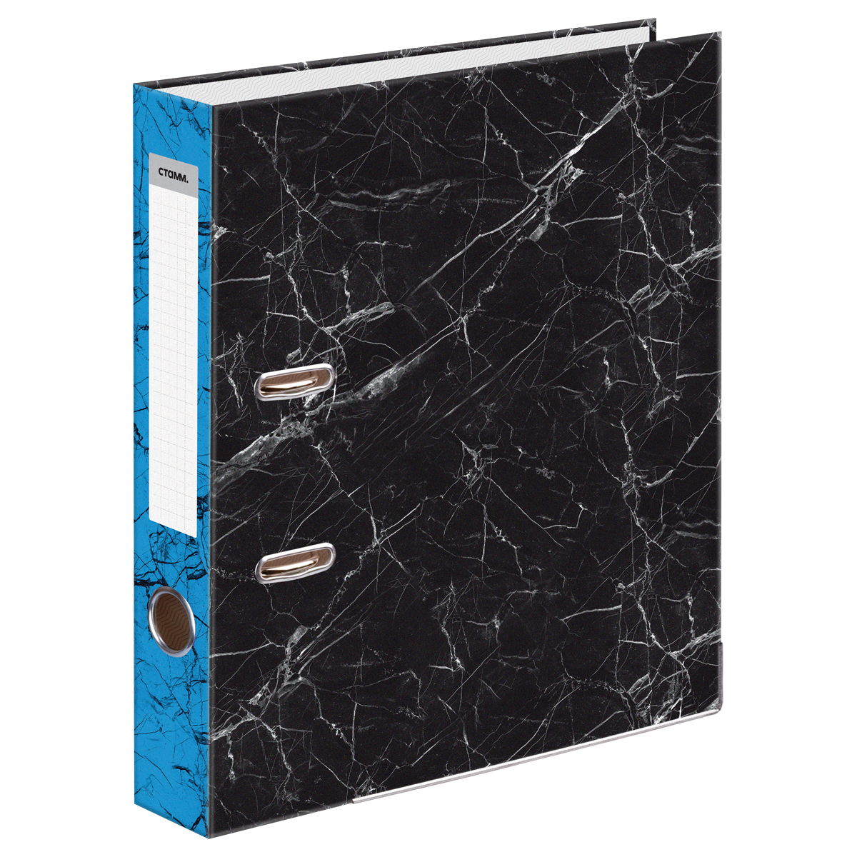 Папка-регистратор СТАММ, 50мм, мрамор, черная, синий корешок, нижний метал. кант