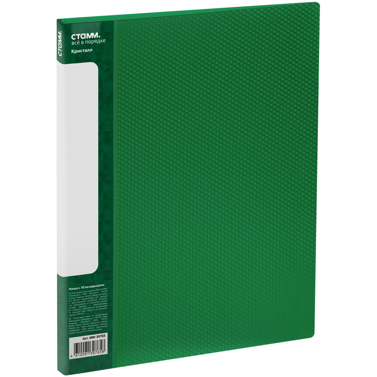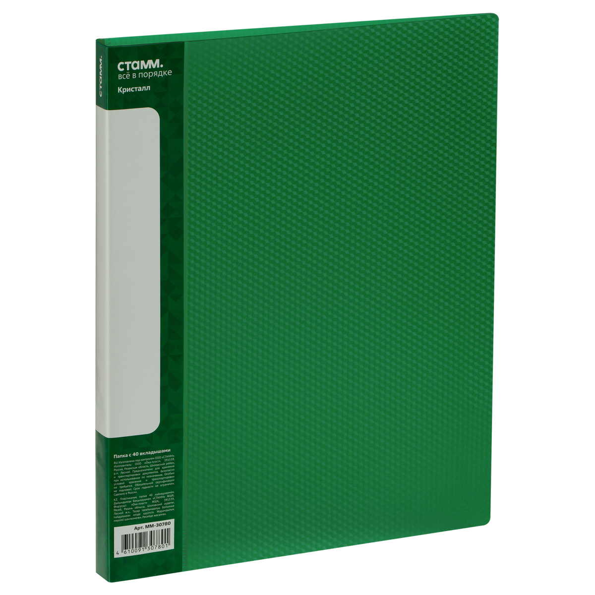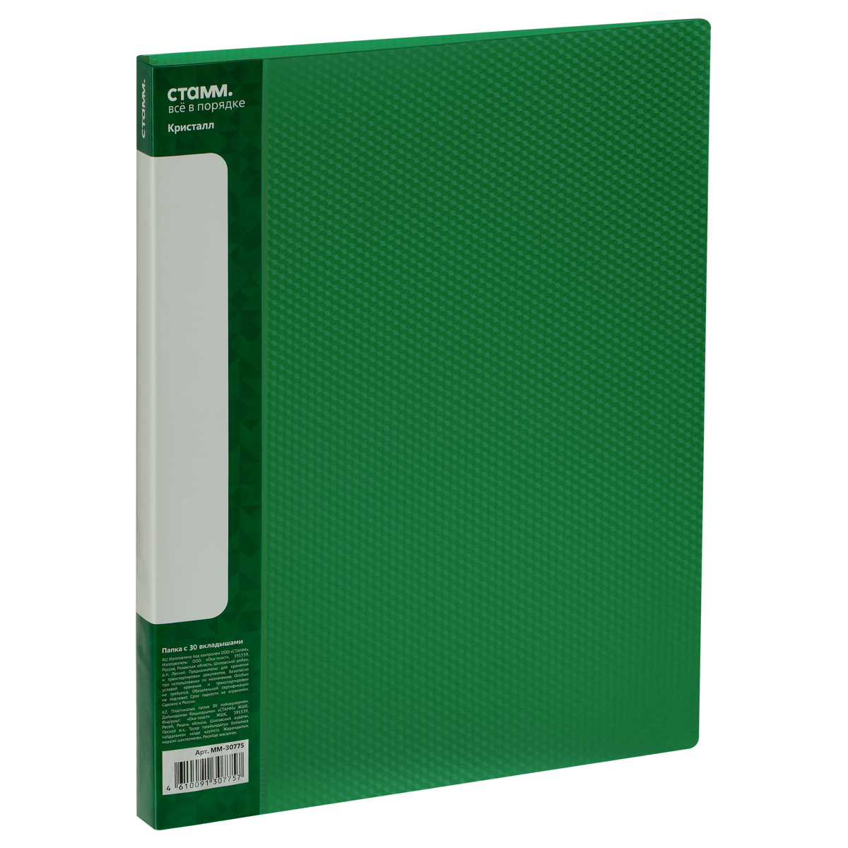 Папка с 30 вкладышами СТАММ "Кристалл" А4, 17мм, 700мкм, пластик, зеленая