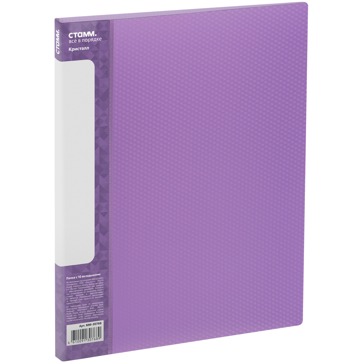 Папка с 10 вкладышами СТАММ "Кристалл" А4, 9мм, 600мкм, пластик, фиолетовая