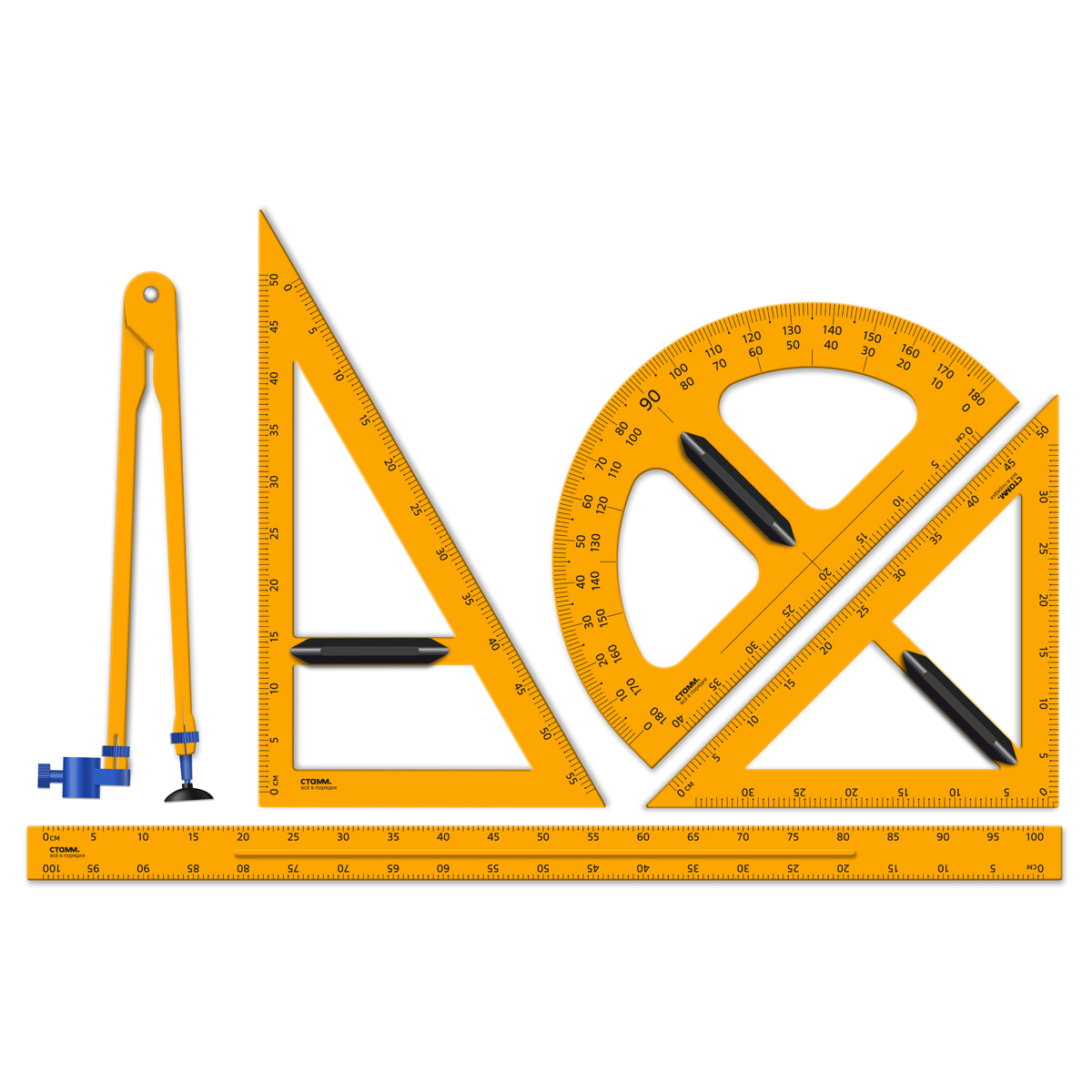 Набор для школьной доски СТАММ (линейка 100см, треугольник 30°, треугольник 45°, транспортир, циркуль), желтый, коробка