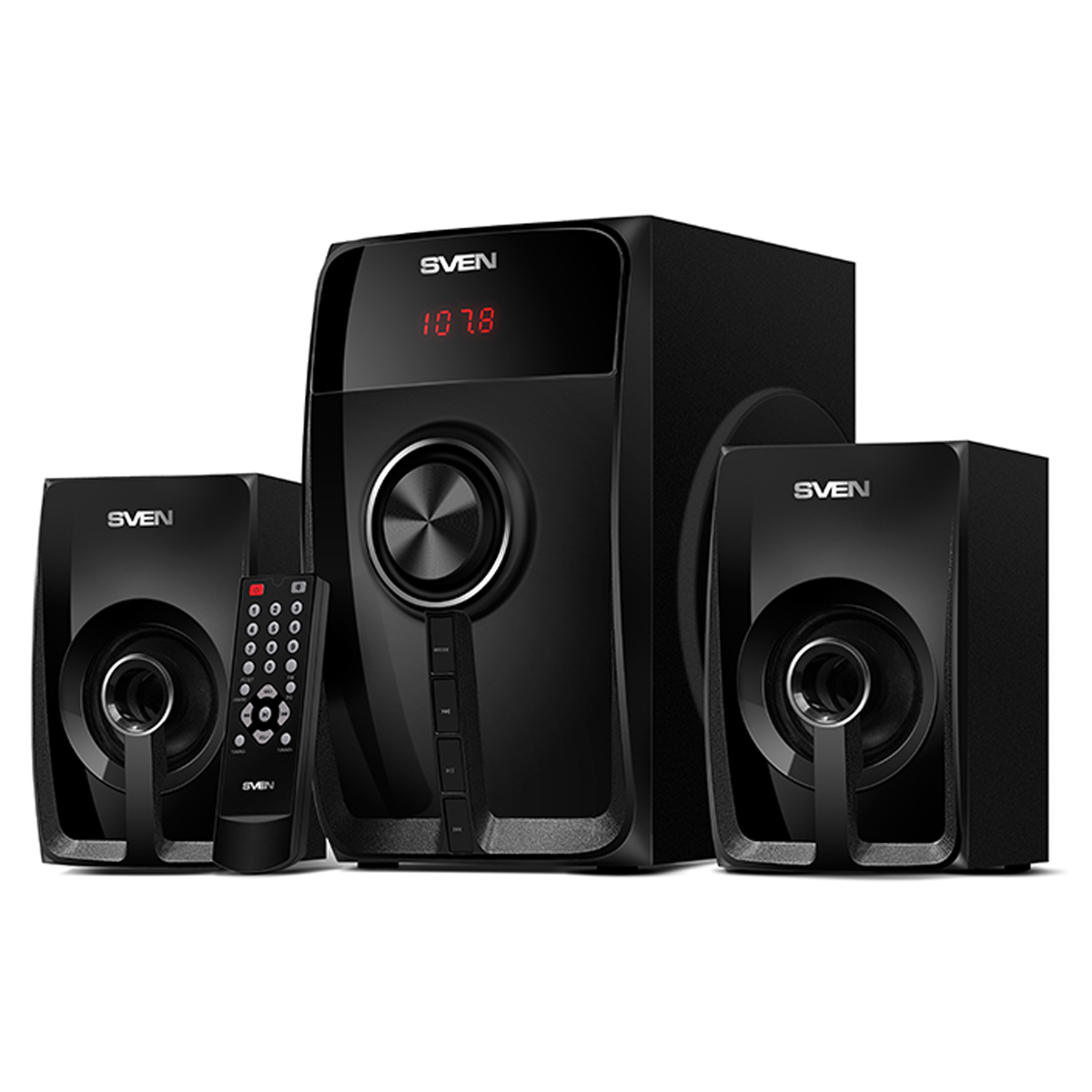 Колонки Sven MS-307, 2*10W+Subwoofer 20W, деревянный корпус, Bluetooth, FM, LED-дисплей, пульт, USB, SD, черный