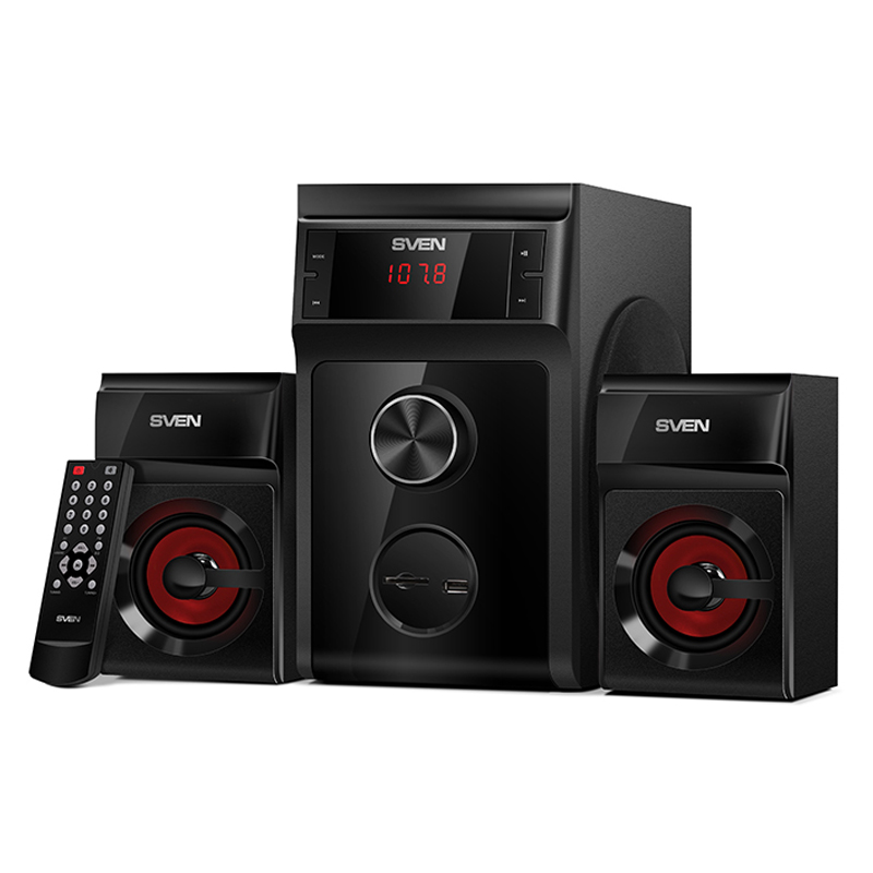 УЦЕНКА-Колонки Sven MS-302, 2*10W+Subwoofer 20W, деревянный корпус, LED-дисплей, пульт, USB, SD, черный