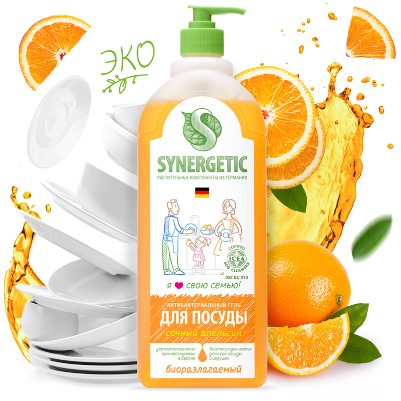 Средство для мытья посуды, фруктов, игрушек Synergetic "Сочный апельсин", антибакт, с дозатором, 1л