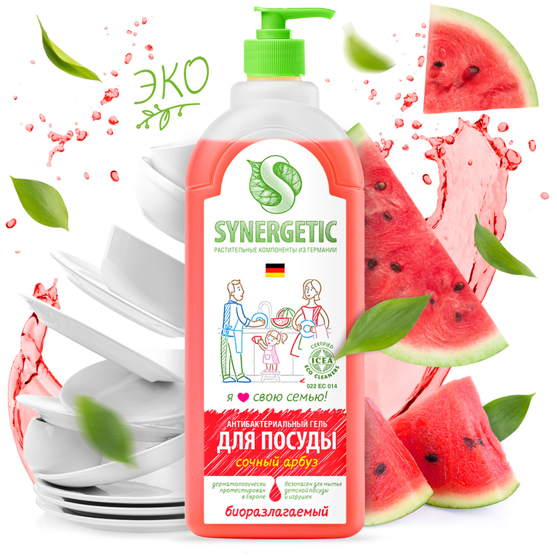 Средство для мытья посуды, фруктов, игрушек Synergetic "Арбуз", антибакт., концентрат, с дозатором, 1л