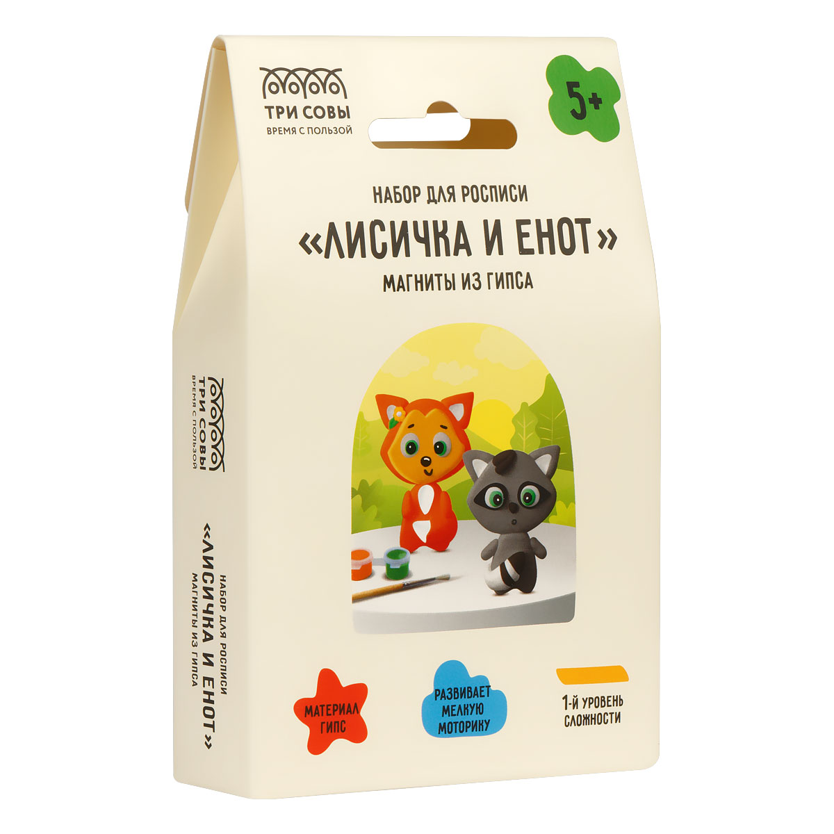 Набор для росписи из гипса ТРИ СОВЫ "Лисичка и Енот", магниты, 2 фигурки, с красками и кистью, картонная коробка