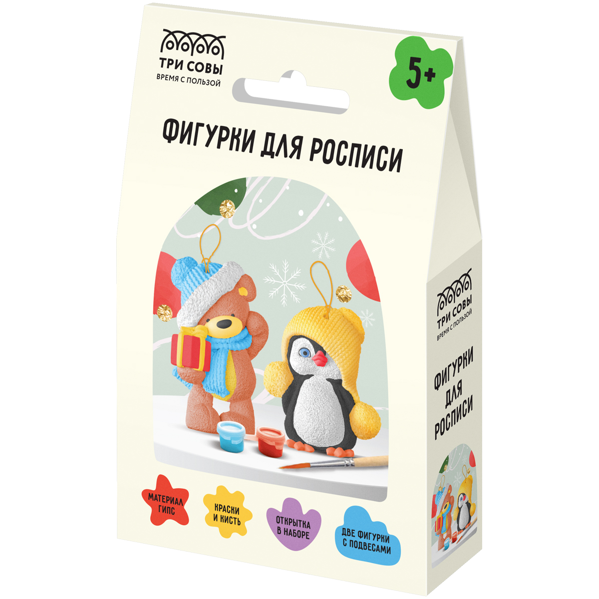 Набор для росписи фигурок из гипса ТРИ СОВЫ "Мишка и Пингвин", 2 фигурки с подвесом, с красками и кистью, картонная коробка