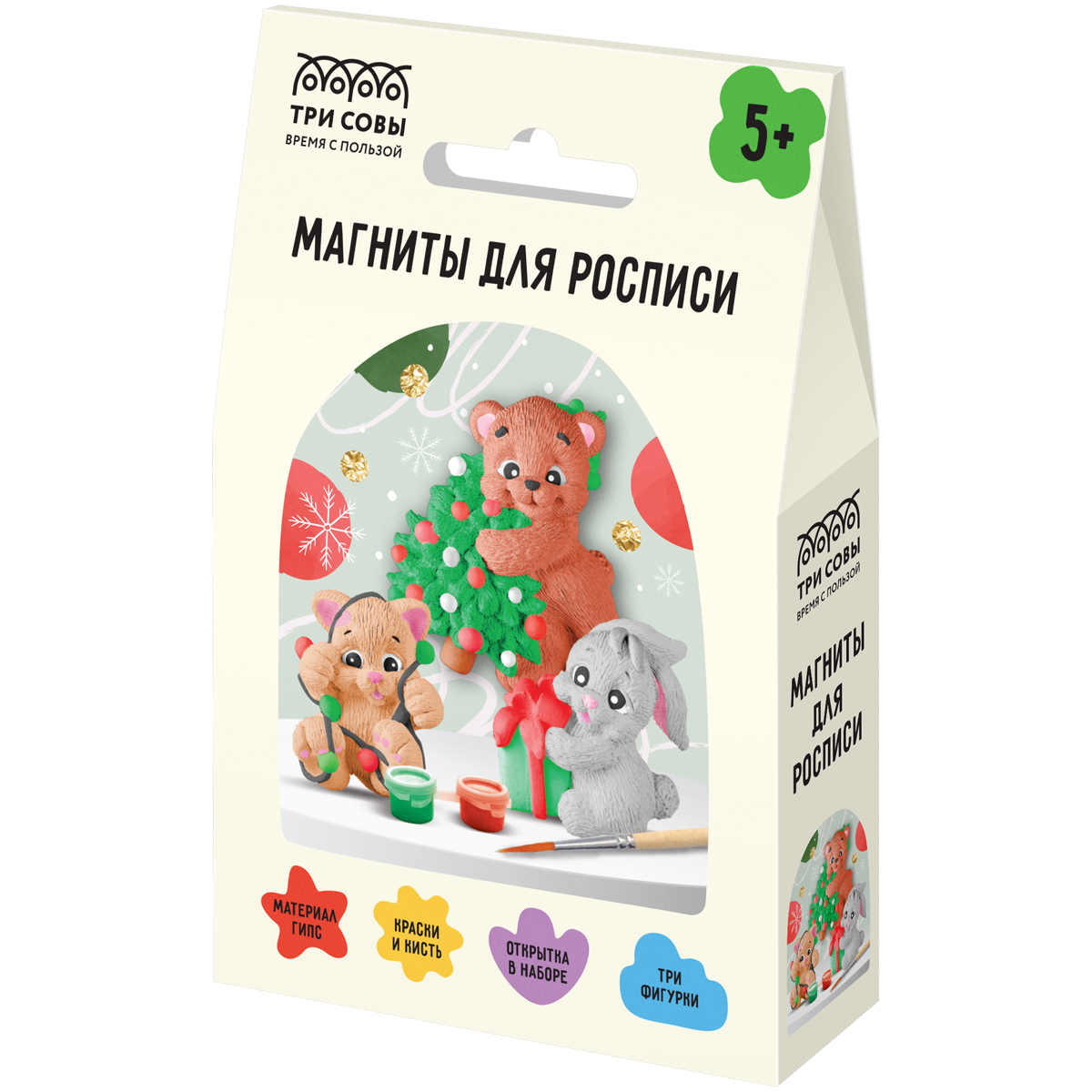 Магниты для росписи из гипса ТРИ СОВЫ "Зверушки", 3 фигурки, с красками и кистью, картонная коробка