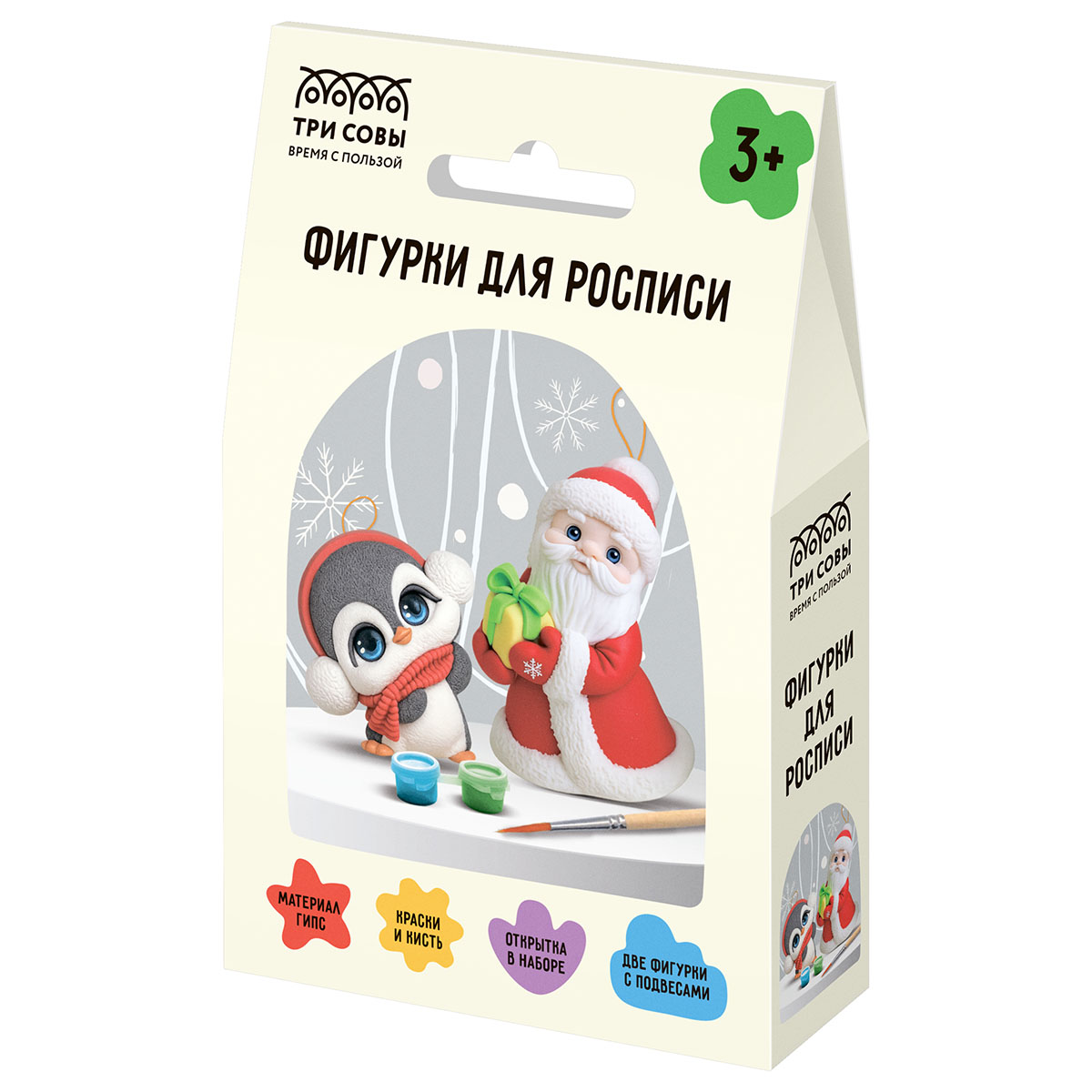 Набор для росписи фигурок из гипса ТРИ СОВЫ "Дед Мороз и пингвин", 2 фигурки с подвесом, с красками и кистью, картонная коробка