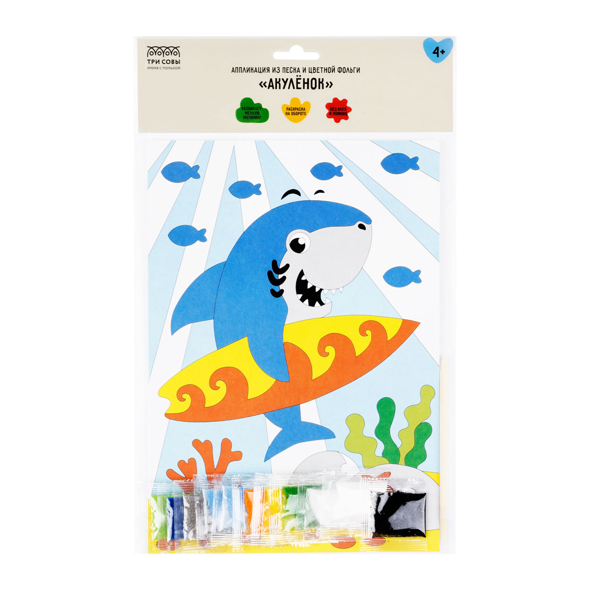 Аппликация из песка и цветной фольги ТРИ СОВЫ "Акуленок", с раскраской, пакет с европодвесом