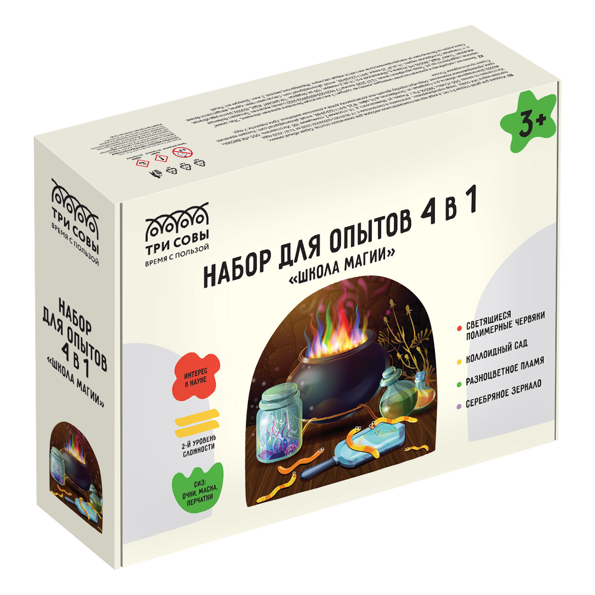 Набор для опытов 4в1 ТРИ СОВЫ "Школа магии", светящиеся полимерные червяки, коллоидный сад, разноцветное пламя, серебряное зеркало, СИЗ, картонная кор