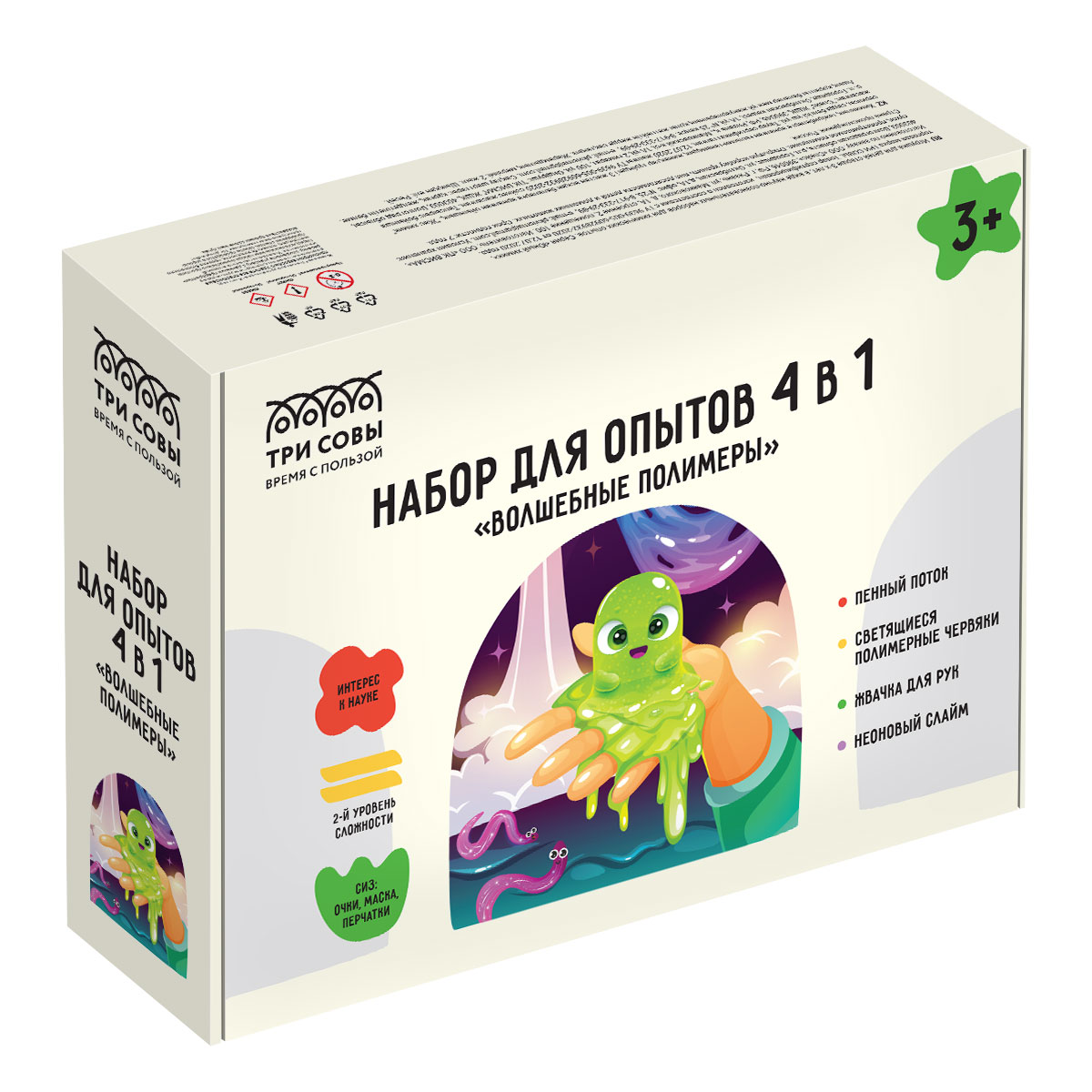 Набор для опытов 4в1 ТРИ СОВЫ "Волшебные полимеры", пенный поток, светящиеся полимерные червяки, жвачка для рук, неоновый слайм, СИЗ, картонная коробк
