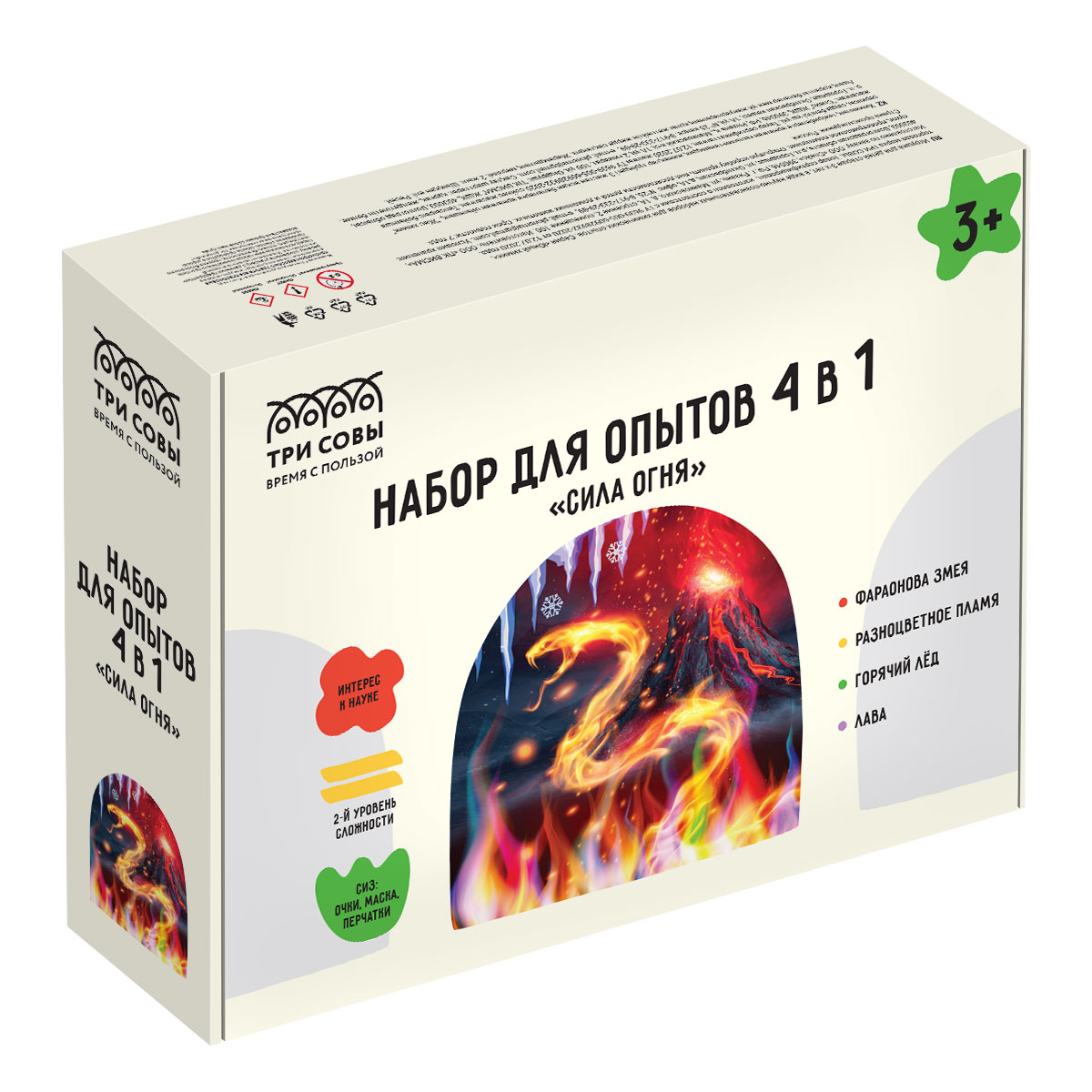 Набор для опытов 4в1 ТРИ СОВЫ "Сила огня", фараонова змея, разноцветное пламя, горячий лед, лава, СИЗ, картонная коробка