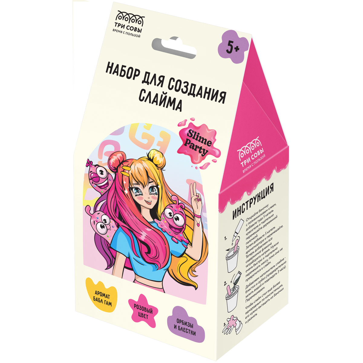 Набор для создания слайма ТРИ СОВЫ Slime party "Аниме", розовый, наполнение - орбизы и блестки, аромат бабл гам, картонная коробка
