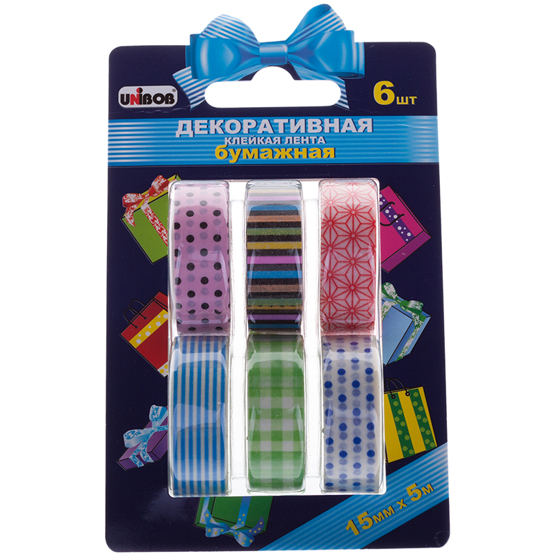 Клейкая лента декоративная 15мм*5м, Unibob, 6шт., разноцветная, бумажная