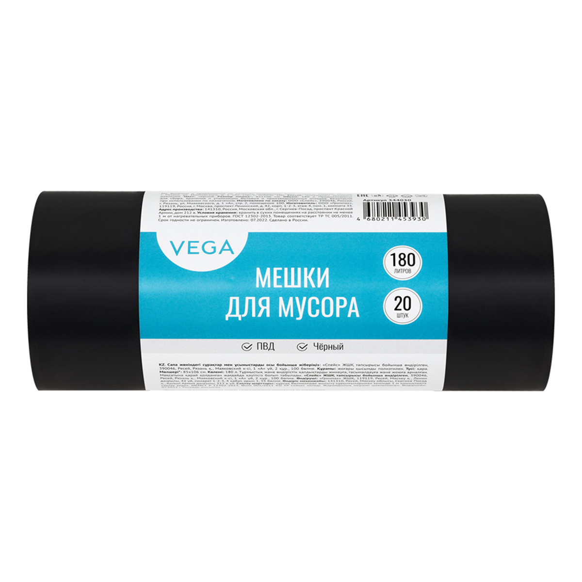 Мешки для мусора 180л Vega ПВД, 80*106см, 25мкм, 20шт., черные, в рулоне