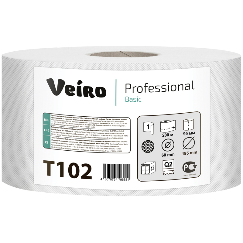 Бумага туалетная 200 м, VEIRO Professional (Система T2), КОМПЛЕКТ 12 шт., Basic, T102
