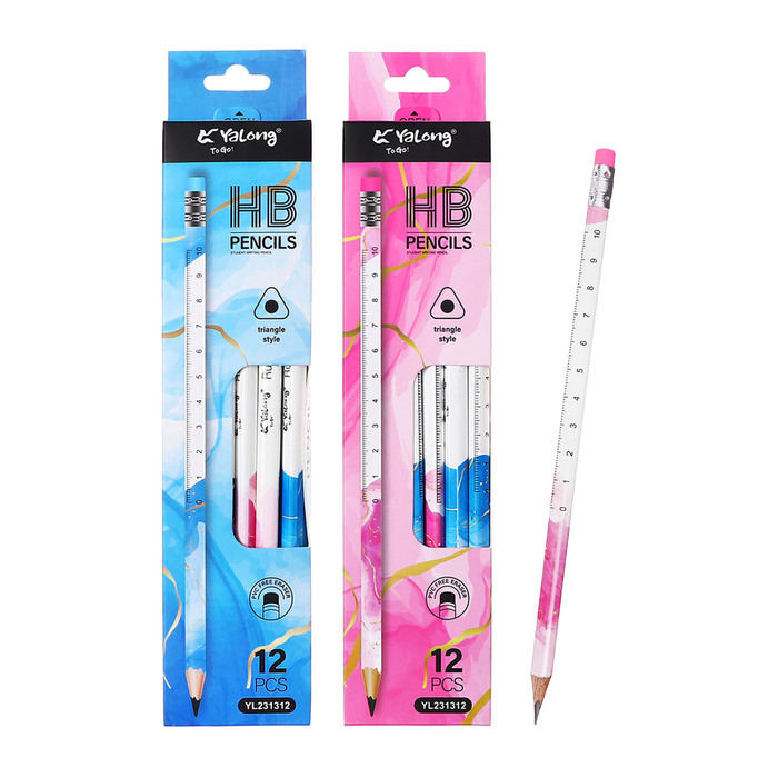 Карандаш чернографитный НВ с ластиком, Линейка, корпус треугольный МИКС