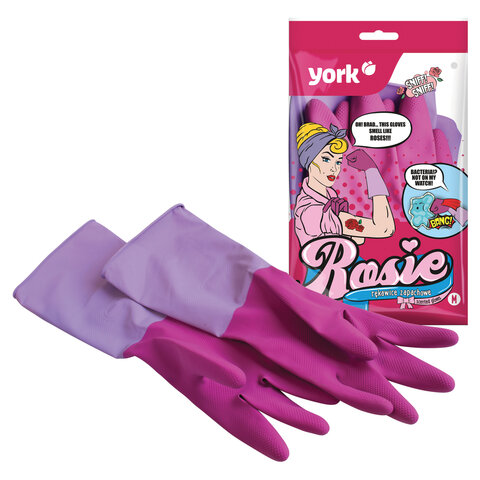 Перчатки резиновые хозяйственные York "Рози", многоразовые, с удлиненной манжетой, хлопчатобумажное напыление, ароматизированные, разм. М