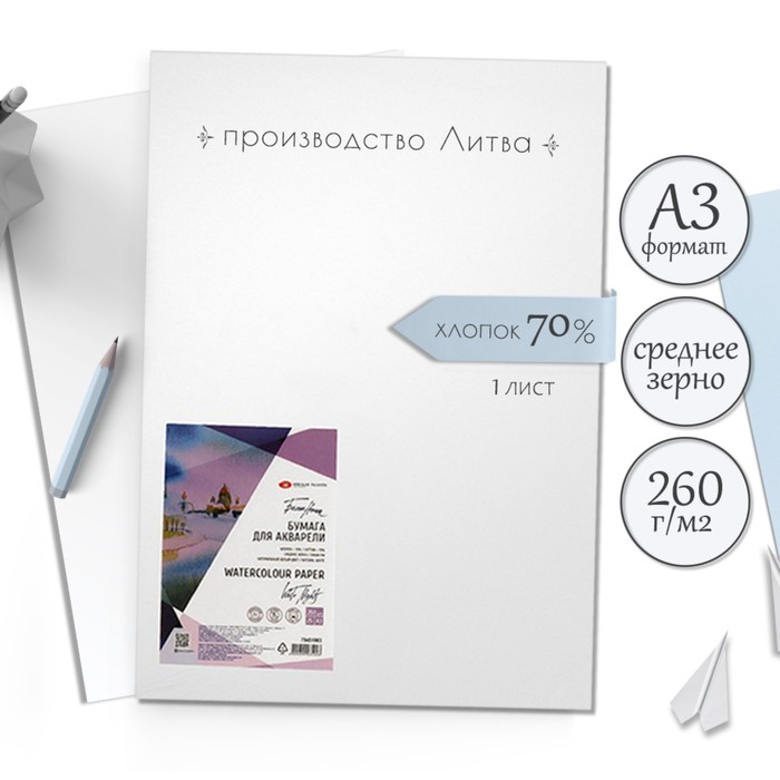 Бумага для акварели, ХЛОПОК 70%, А3, ЗХК "Белые ночи", 1 лист, 260 г/м2, средне зерно, 79451983