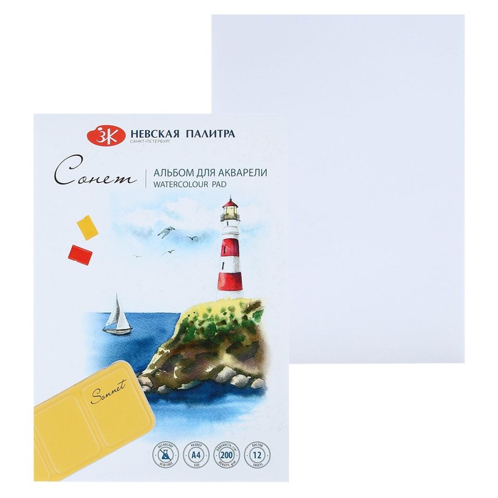 Альбом для акварели А4, ЗХК "Сонет", 12 листов, 200 г/м2, на склейке, среднезернистая, (80451641)