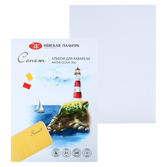 Альбом для акварели А3, ЗХК "Сонет", 12 листов, 200 г/м2, на склейке, среднезернистая, (80451642)