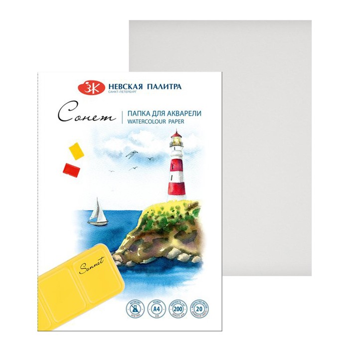 Бумага для акварели в папке А4, ЗХК "Сонет", 20 листов, 200 г/м2, среднезернистая, (80451623)