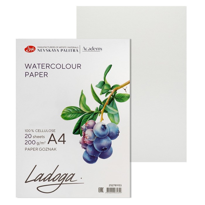 Бумага для акварели в папке А4, ЗХК "Ладога", 20 листов, 200 г/м2, среднезернистая, (252781933)