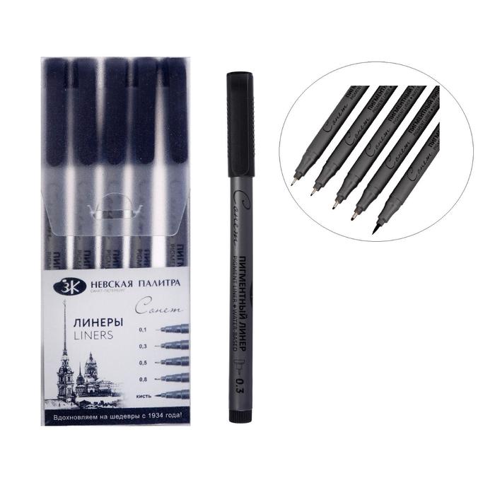 Набор ручек капиллярных ЗХК "Сонет", разные типы, 5 штук (0.1/.03./0.5/0.8/кисть), чёрный