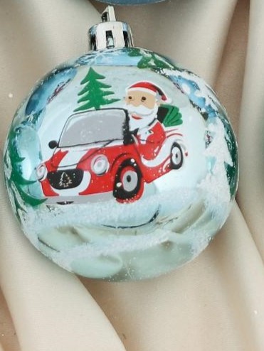 Шар пластик d-6 см, 1 шт "Дед Мороз на автомобиле" голубой