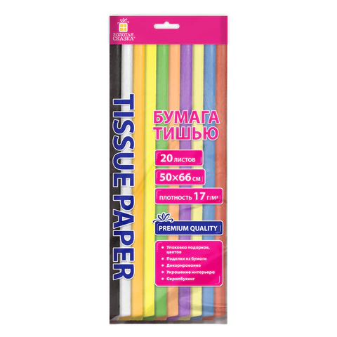Цветная бумага ТИШЬЮ 17г/м2, 50х66см, 20 листов 10 цветов интенсив ассорти, ЗОЛОТАЯ СКАЗКА, 116494