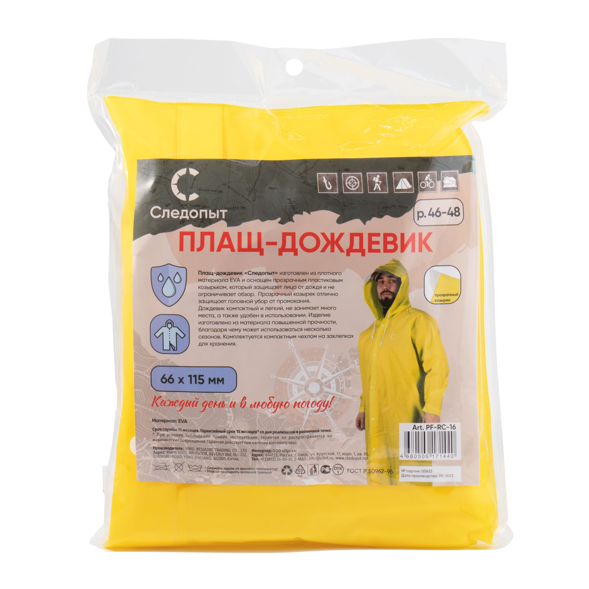 Плащ-дождевик СЛЕДОПЫТ, плотный EVA, 68х120 см, с козырьком на капюшоне и чехлом, желтый, р.48-50/50