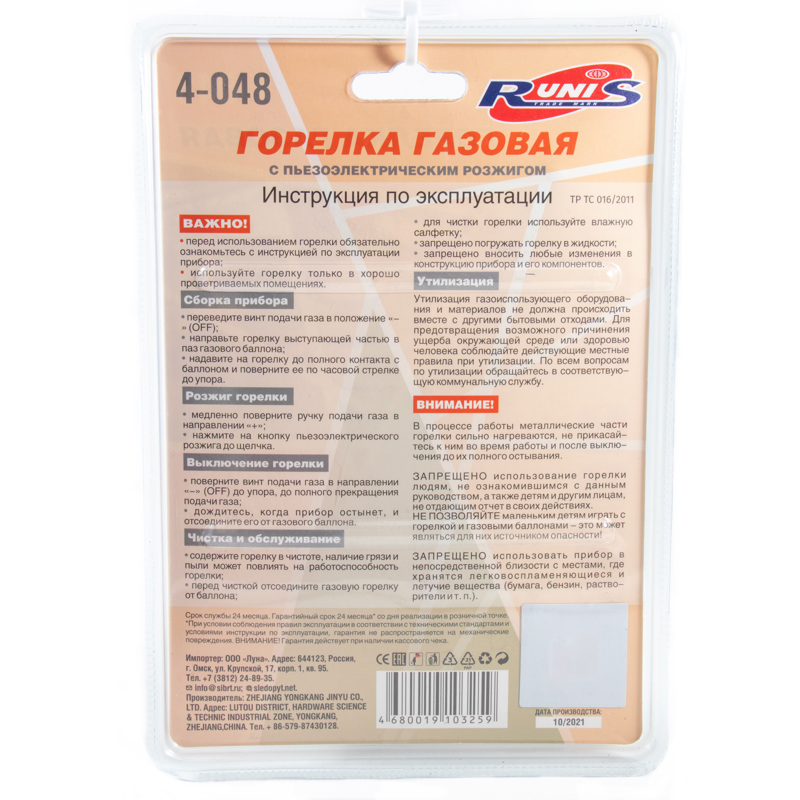 Газовая горелка RUNIS №10, пьезо. (цанг.)/100/