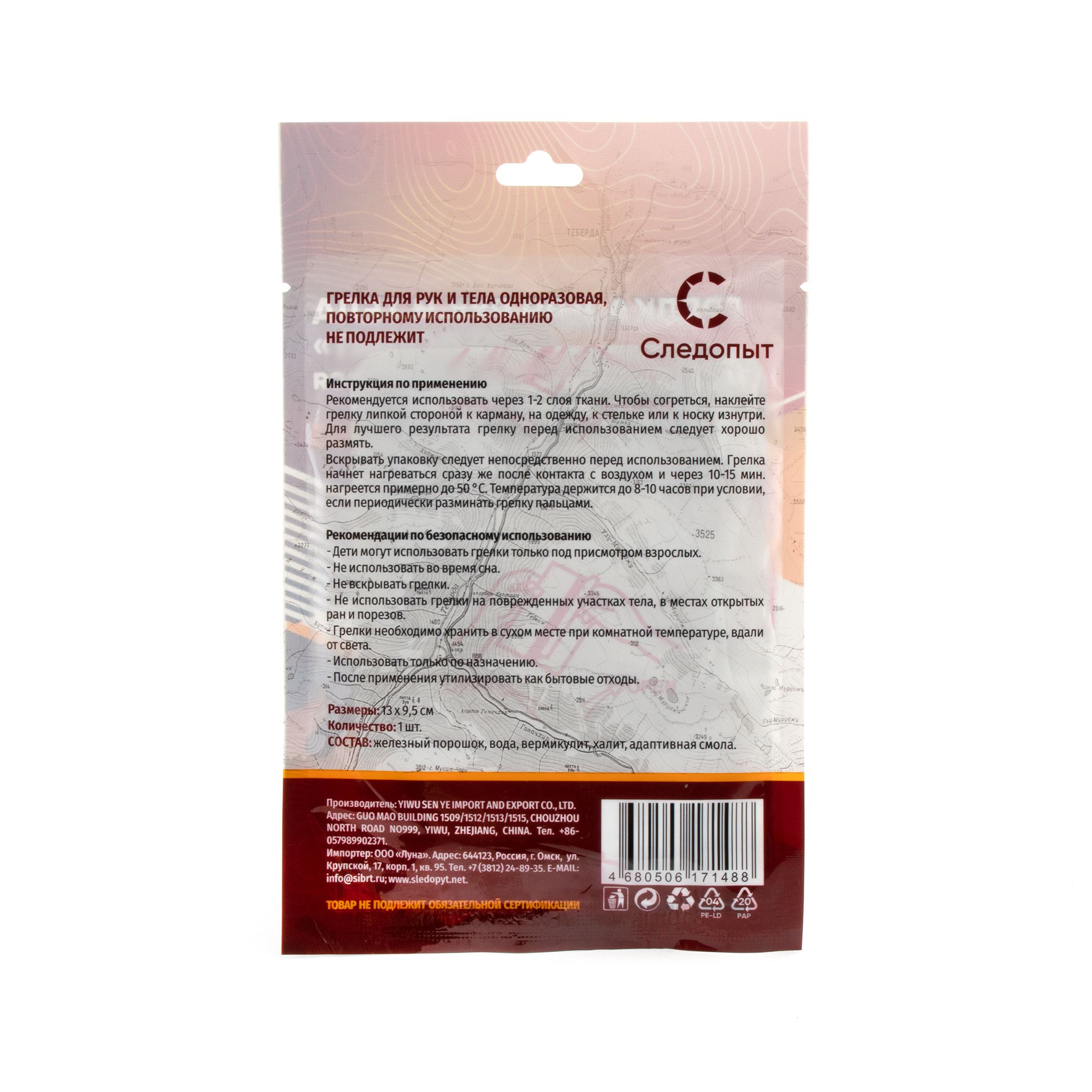 Грелка для тела и рук СЛЕДОПЫТ самонагревающаяся, 1 шт 13х9,5 см/100/300/