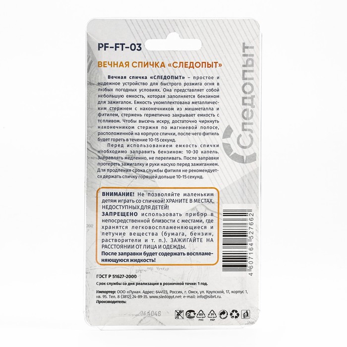 Спичка вечная "СЛЕДОПЫТ" 1,9 х 1,6 х 6,5 см