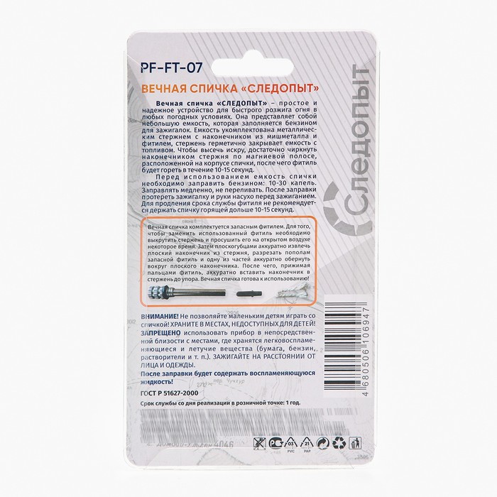 Спичка вечная "СЛЕДОПЫТ" 1,9 х 1,6 х 6,5 см