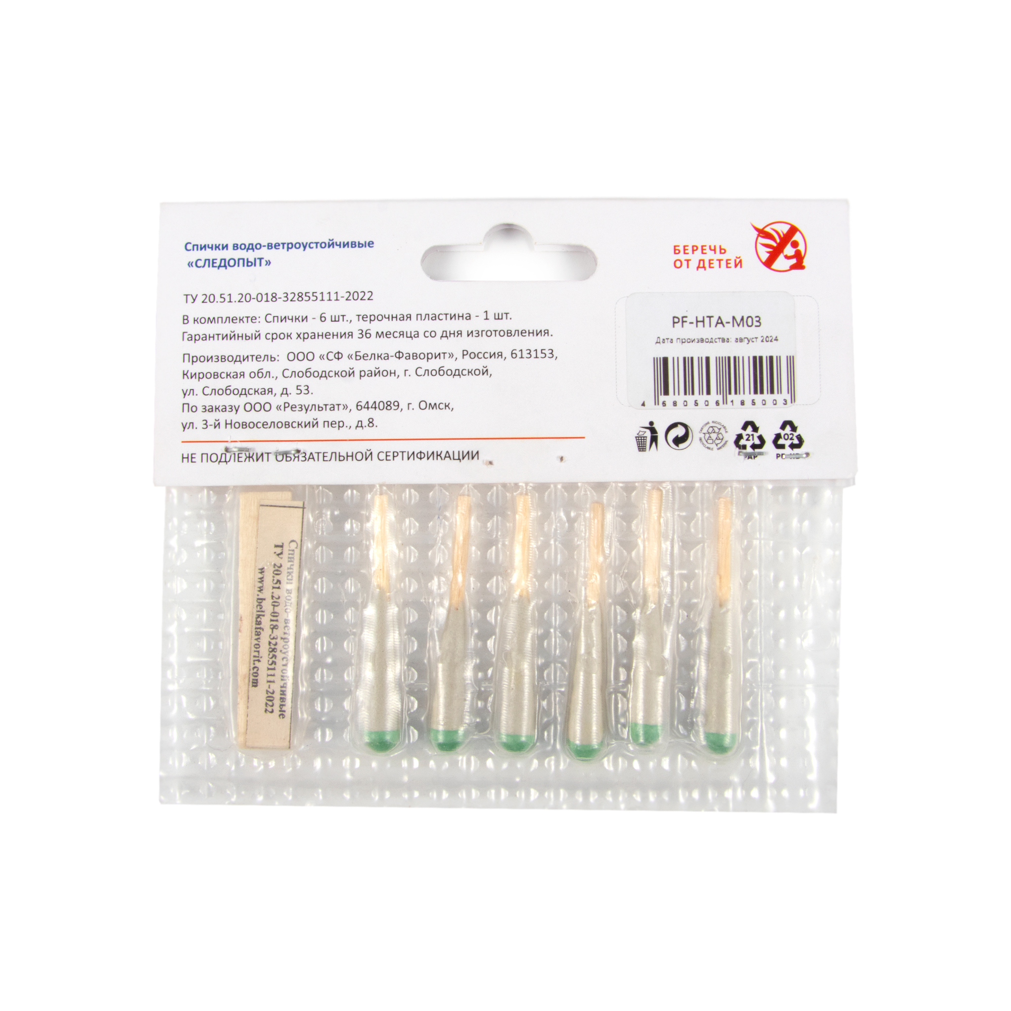 Спички водо-ветроустойчивые "СЛЕДОПЫТ" 4,2 см, 6 шт/300/