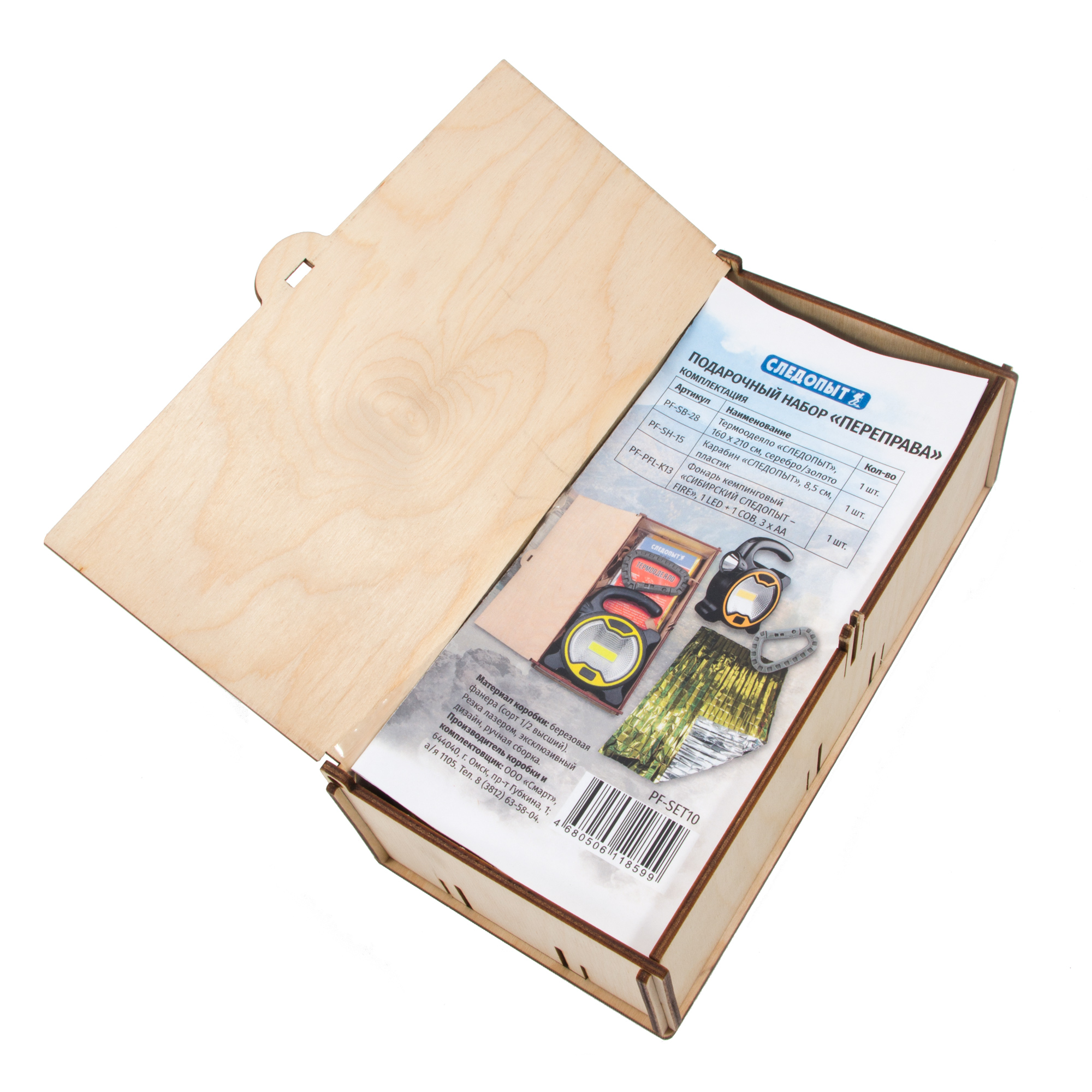 Подарочный набор "СЛЕДОПЫТ - Переправа" (коробка фанерная, термоодеяло, карабин, фонарь)/10/