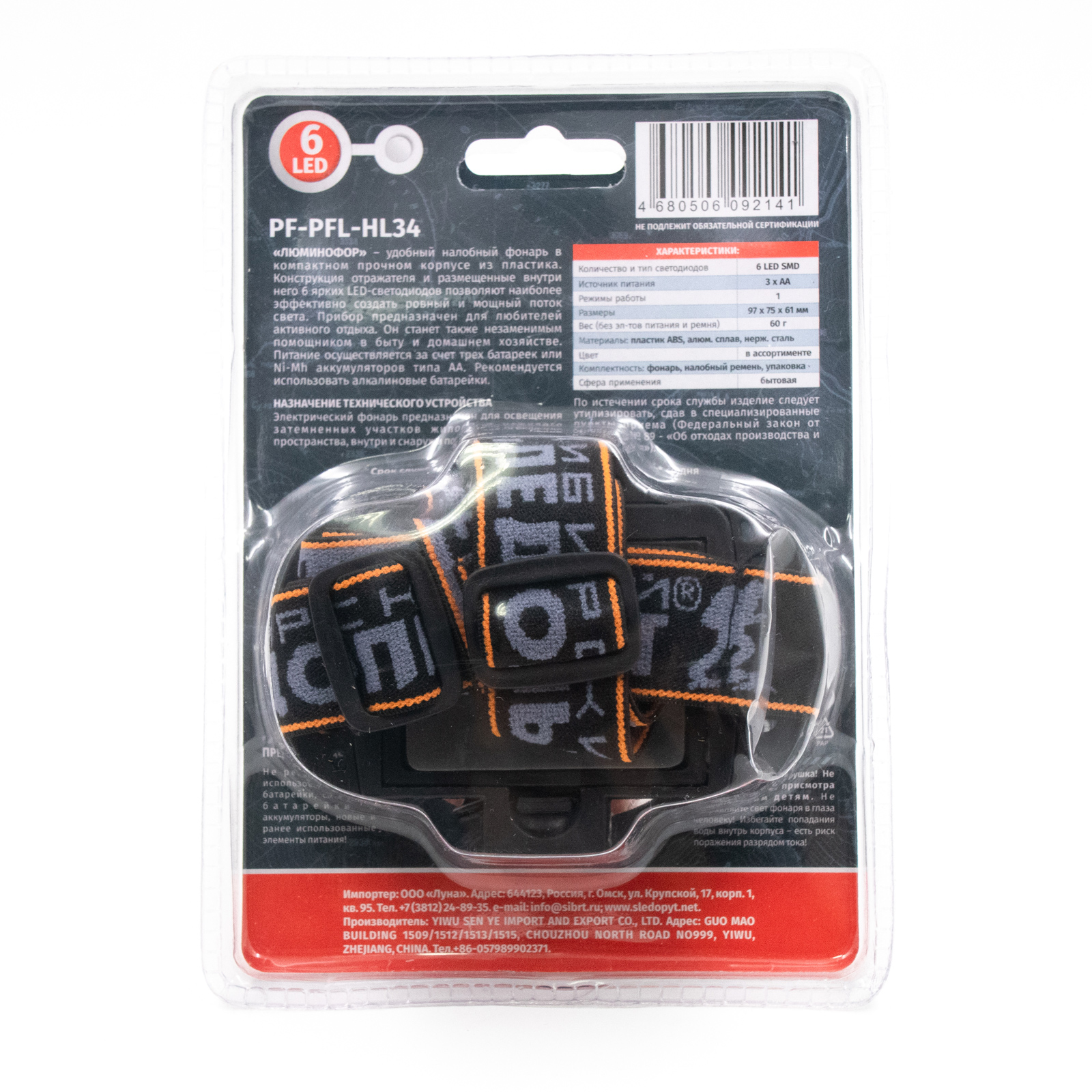 Фонарь налобный "СИБИРСКИЙ СЛЕДОПЫТ-Люминофор", 6 SMD LED, 3хАА/120/